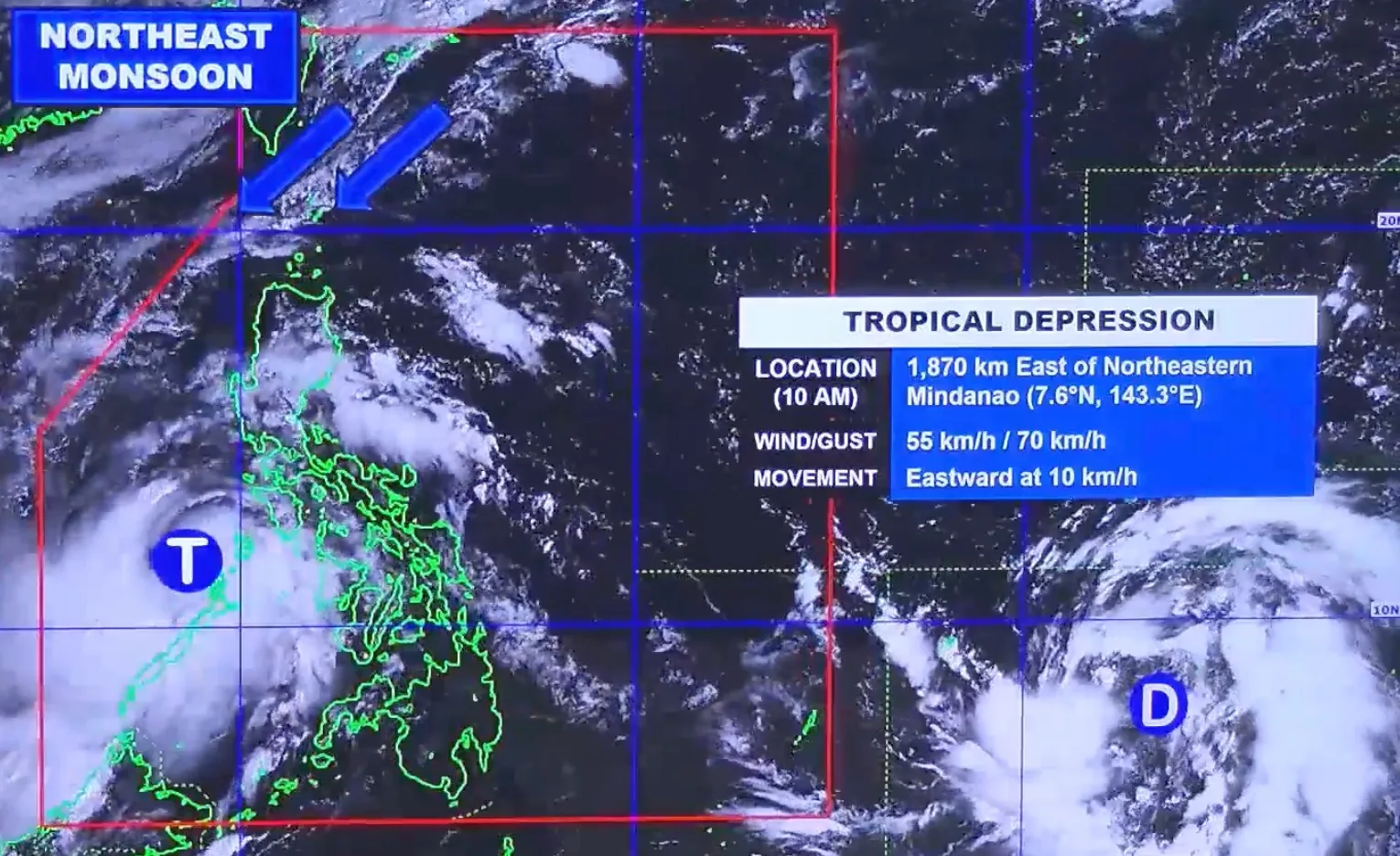The tropical depression was last spotted 1,835 kilometers east of northeastern Mindanao with maximum sustained winds of 55 km/h and gusts of up to 70 km/h, moving east at 10 km/h. PAGASA said it is currently “looping over the Pacific waters south of Guam” and may continue to move erratically for the next 12 to 24 hours.